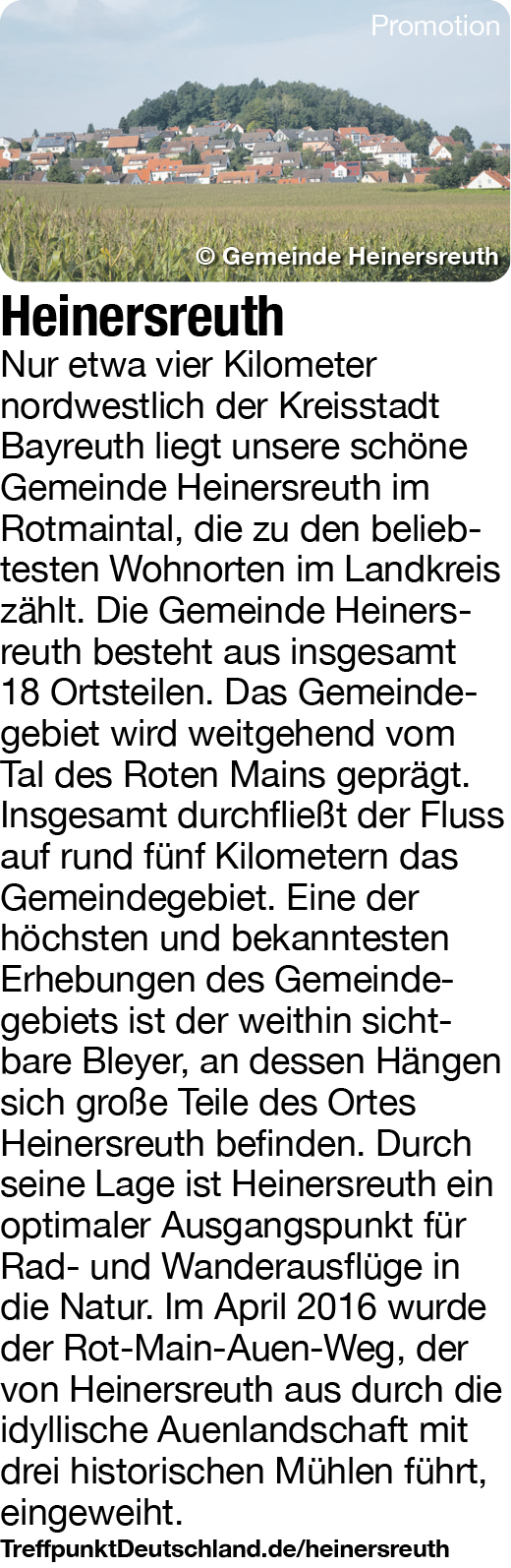 Gemeinde HeinersreuthKulmbacher Straße 1495500 HeinersreuthWebseite09 21 / 74 74 0 -0E-MailZUM REISEFÜHRER HEINERSREUTHEine Anzeige im Auftrag vonGemeinde Heinersreuth
